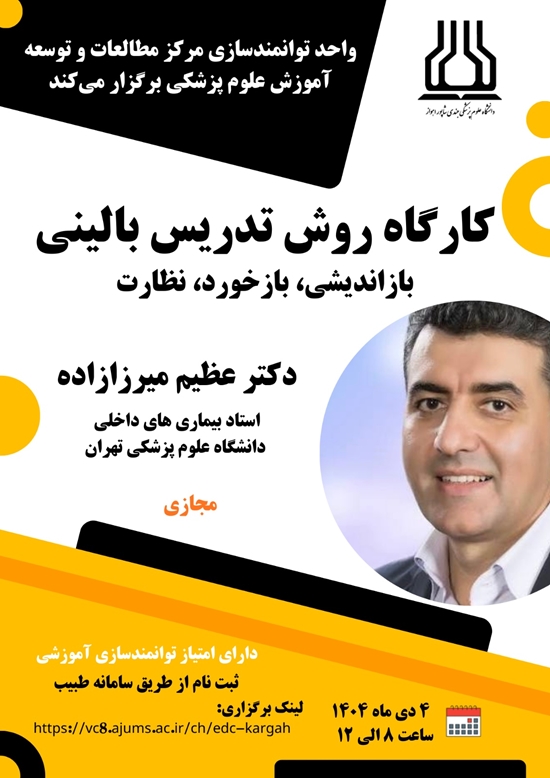 واحد توانمندسازی مرکز مطالعات و توسعه آموزش (EDC) دانشگاه علوم پزشکی اهواز در نظر دارد در راستای ارتقای فرآیند یاددهی–یادگیری در عرصه بالینی، کارگاه آموزشی «روش تدریس بالینی: بازاندیشی، بازخورد، نظارت» را با ارائه جناب آقای دکتر عظیم میرزازاده، استاد گروه بیماری‌های داخلی دانشگاه علوم پزشکی تهران، برگزار نماید.
