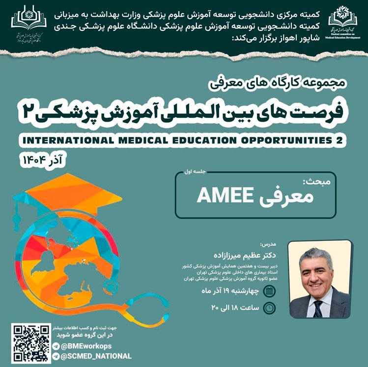 جلسه اول از مجموعه کارگاه‌های معرفی «فرصت‌های بین‌المللی آموزش پزشکی ۲ (International Medical Education Opportunities 2)» با موضوع معرفی AMEE، به همت کمیته مرکزی دانشجویی توسعه آموزش علوم پزشکی وزارت بهداشت و به میزبانی کمیته دانشجویی توسعه آموزش علوم پزشکی دانشگاه جندی‌شاپور اهواز، روز چهارشنبه ۲۱ آذرماه ۱۴۰۴ از ساعت ۱۸ تا ۲۰ برگزار شد.