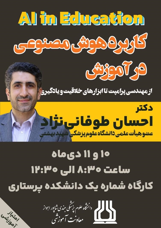 کارگاه آموزشی "کاربرد هوش مصنوعی در آموزش: از مهندسی پرامپت نویسی تا ابزارهای خلاقیت و یادگیری"  توسط دکتر احسان طوفانی نژاد استادیار تکنولوژی آموزشی گروه برنامه ریزی آموزشی از راه دور، دانشکده آموزش پزشکی و فناوری های یادگیری دانشگاه علوم پزشکی شهید بهشتی، در روزهای چهارشنبه و پنج شنبه مورخ 10 و 11 دی ماه از ساعت 08:30 الی 12:30 در محل کارگاه شماره یک دانشکده پرستاری به صورت حضوری برگزار می گردد. (دارای امتیاز آموزشی)