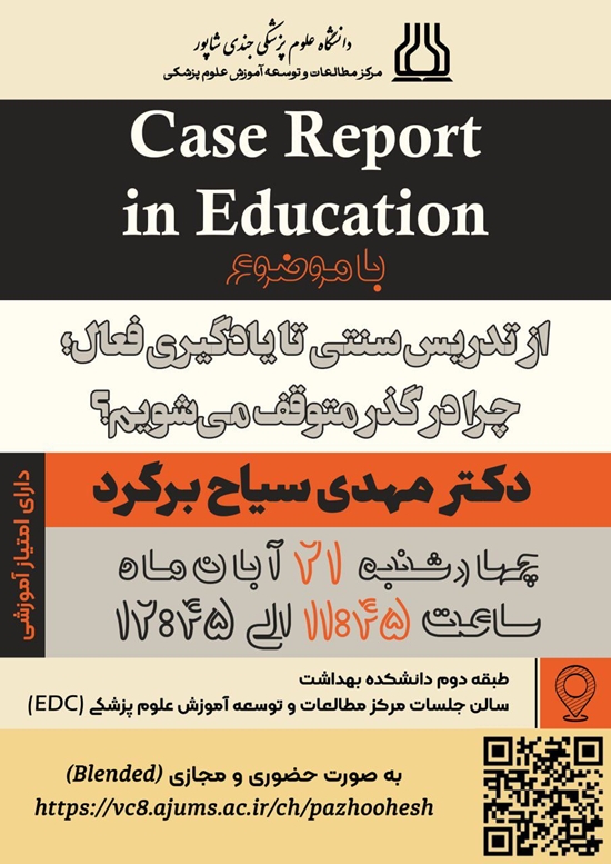 جلسه  Case Report in Education (دارای امتیاز آموزشی) در روز چهارشنبه مورخ 1404/08/21 در محل سالن جلسات مرکز مطالعات واقع در طبقه دوم دانشکده بهداشت از ساعت 11:45 الی 12:45 به صورت blended  (حضوری و مجازی) برگزار می گردد.