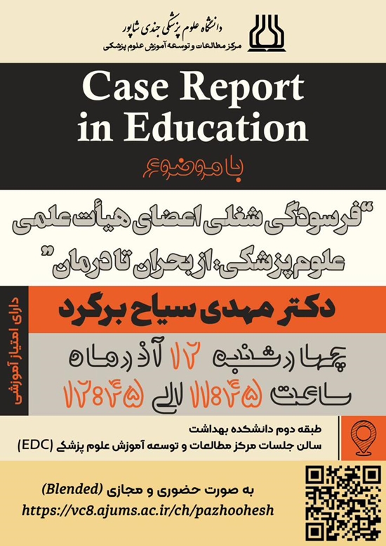 جلسه  Case Report in Education (دارای امتیاز آموزشی) در روز چهارشنبه مورخ 1404/09/12 در محل سالن جلسات مرکز مطالعات واقع در طبقه دوم دانشکده بهداشت از ساعت 11:45 الی 12:45 به صورت blended  (حضوری و مجازی) برگزار می گردد.