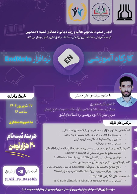 این دوره توسط انجمن علمی دانشجویی تغذیه و رژیم درمانی و با همکاری کمیته دانشجویی توسعه آموزش دانشکده پیراپزشکی دانشگاه جندیشاپور اهواز، در تاریخ ۲۷ شهریور ماه ۱۴۰۴ به صورت مجازی برگزار گردید. مدرس این کارگاه جناب آقای مهندس علی حسنی بودند که نحوه کار با نرم افزار کاربردی اندنوت را تدریس نمودند. این دوره که به صورت کشوری برای همهی دانشجویان و فارغالتحصیلان در تمامی رشتهها تدارک دیده شده بود، با استقبال شرکت کنندگان همراه شد. در پایان جلسات فیلم ضبط شده کارگاه در اختیار شرکت کنندگان قرار گرفت.